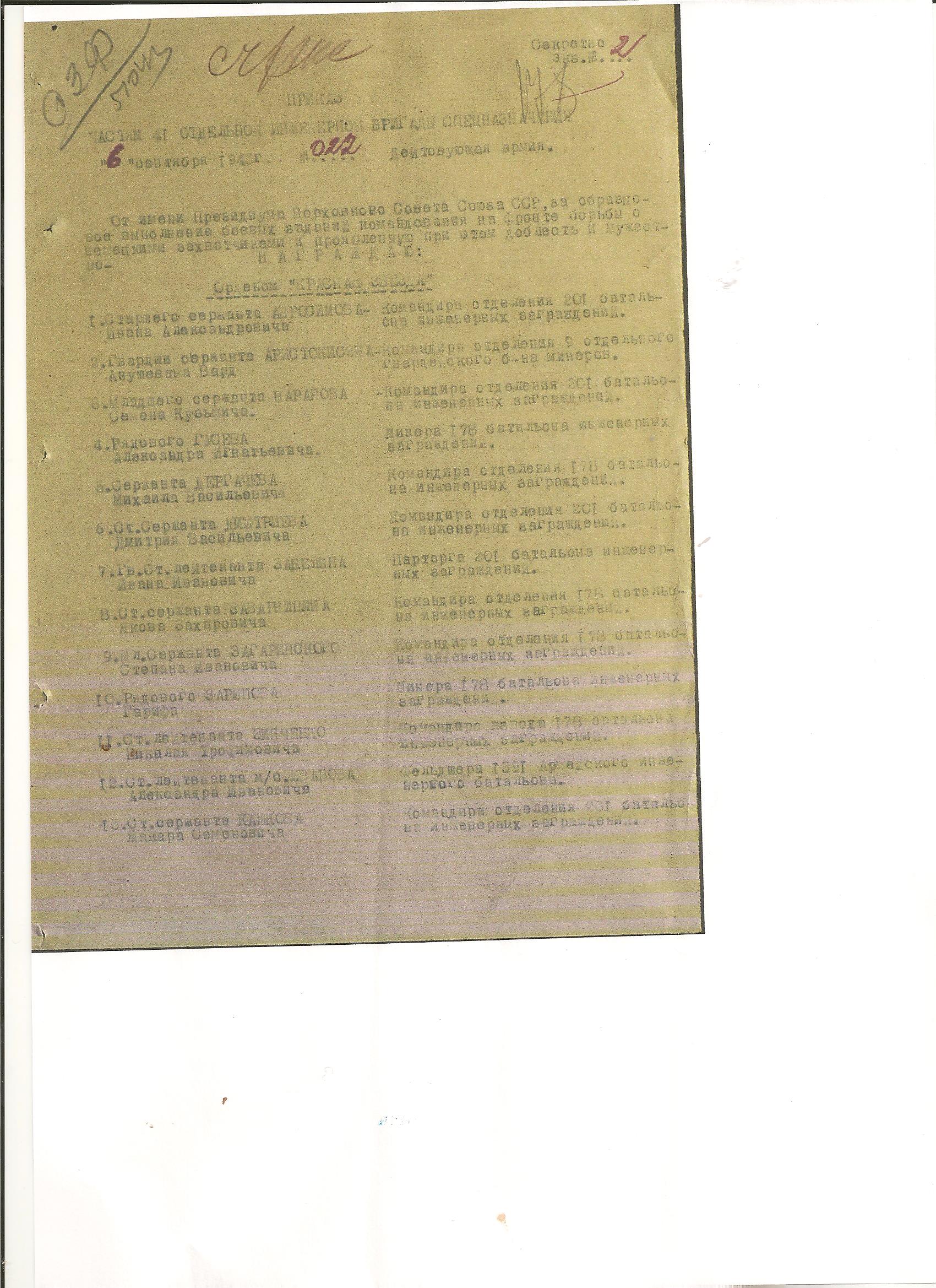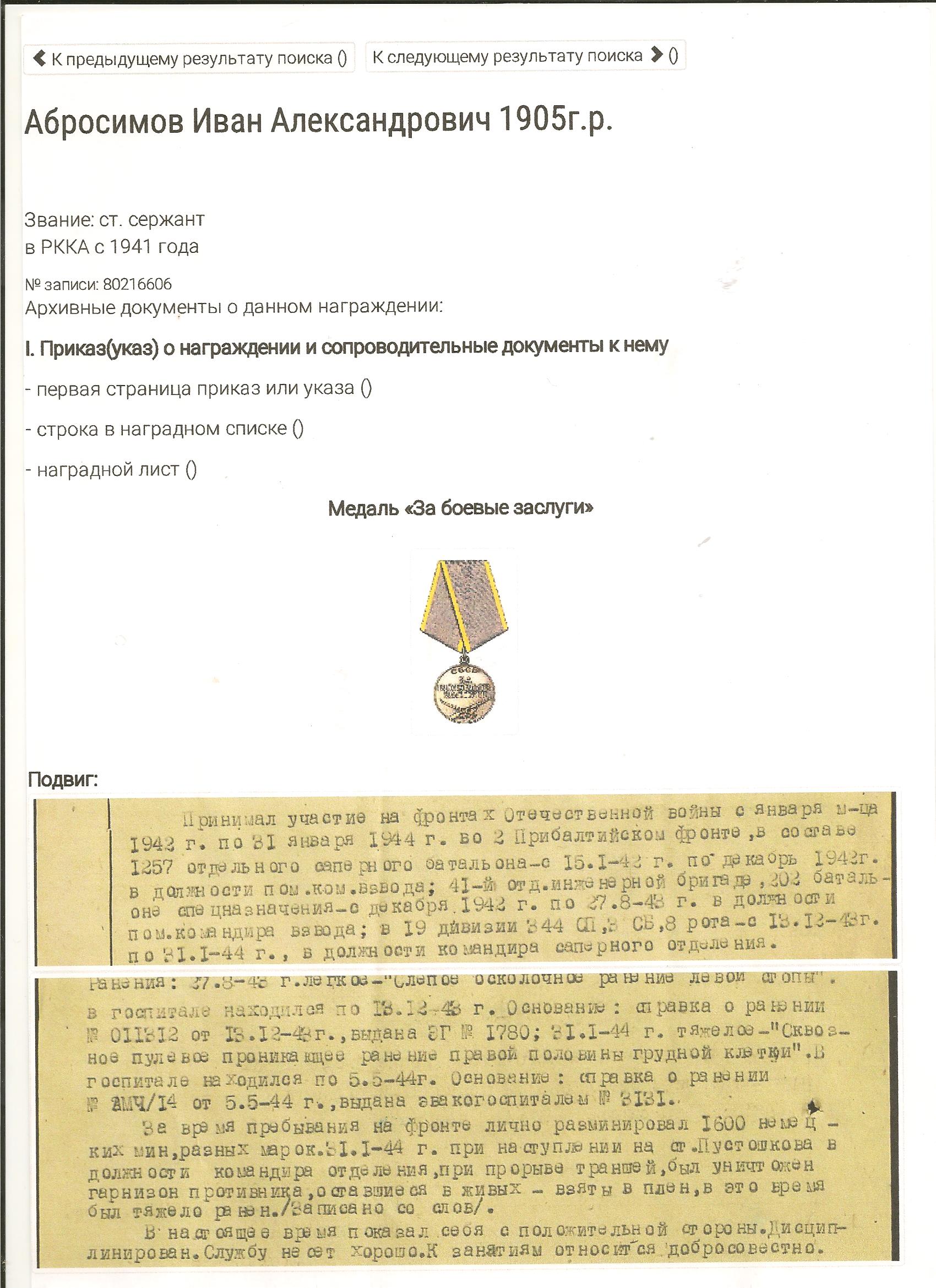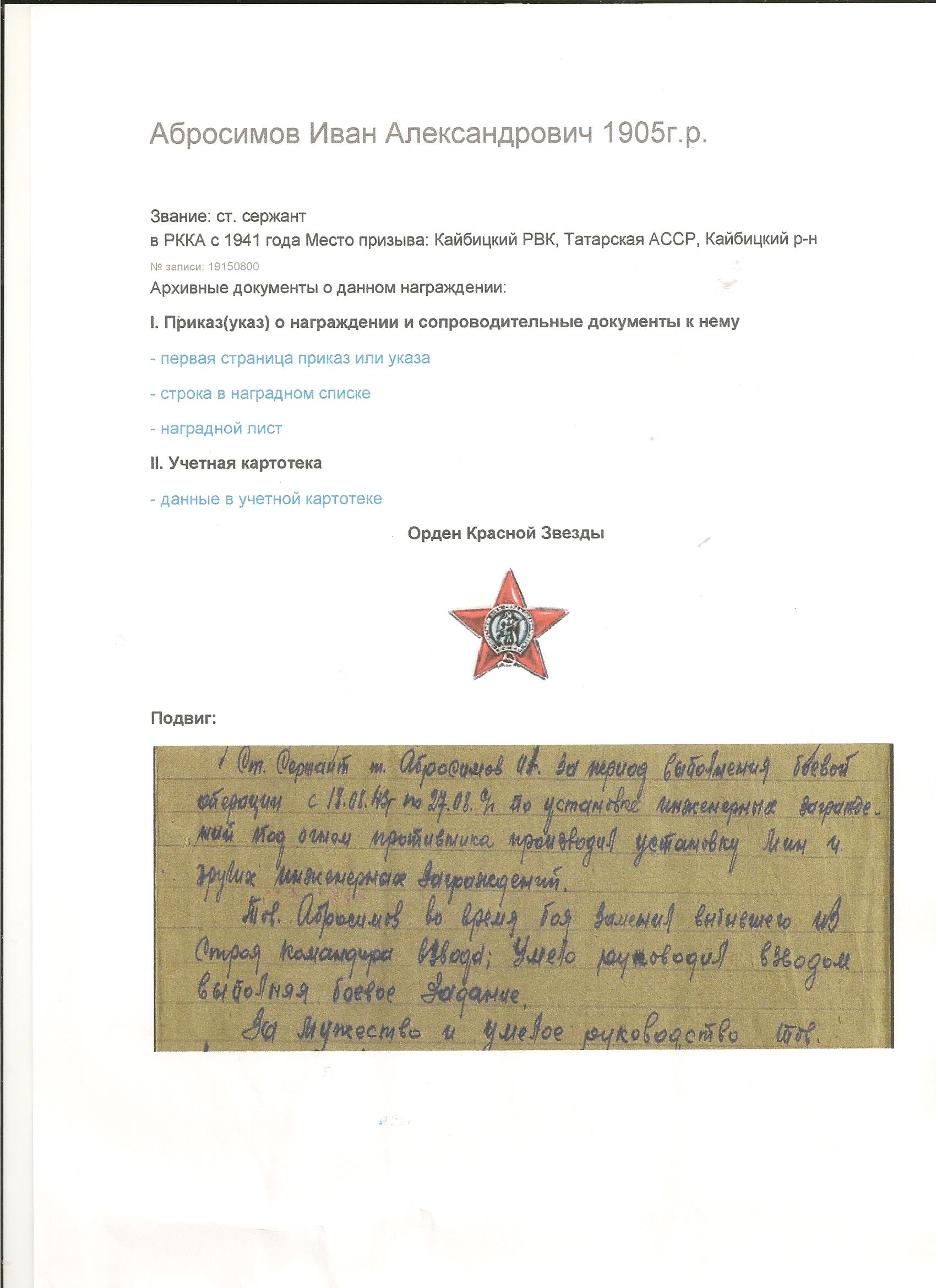 14 февраля 2015 г. в администрацию нашего сельского поселения пришел депутат по Нижнекулангинском у округу Абросимов Андрей Анатольевич. Он сказал, что прочитал на сайте Кулангинского сельского поселения о том, что продолжается уточнение списков участников ВОВ погибших и умерших после войны. И в Книге Памяти Кайбицкого района « Они вернулись с Победой » он не нашел фамилию своего деда Абросимова Ивана Александровича ,1905 г.р., который умер 05.12.1972 году и похоронен в д. Большая Куланга . Андрей предоставил нам отсканированные выписки к наградам из Военного центрального архива России. Абросимов Иван Александрович в 06.09.1943 году за проявленную доблесть и мужество был награжден орденом Красной Звезды. За время пребывания на фронте лично разминировал 1600 немецких мин разных марок. Также был награжден медалью «За боевые заслуги» . После возвращения с фронта он возглавлял колхоз « Путь Ильича» . Благодарим всех , кто помогает нам восстановить списки участников ВОВ ! Наш святой долг не забывать о бессмертном подвиге наших солдат и оставить об этом в памяти молодого поколения .